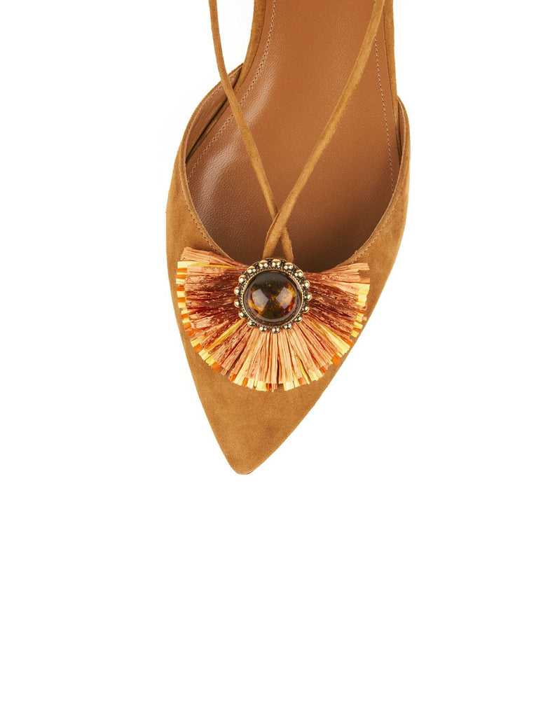 - Raffia fringe & rhinestone embellishment