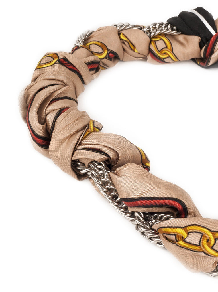 • Includes chain-link-print twill scarf that wraps around the straps.
