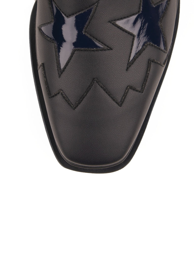 - Faux patent leather star embellishments